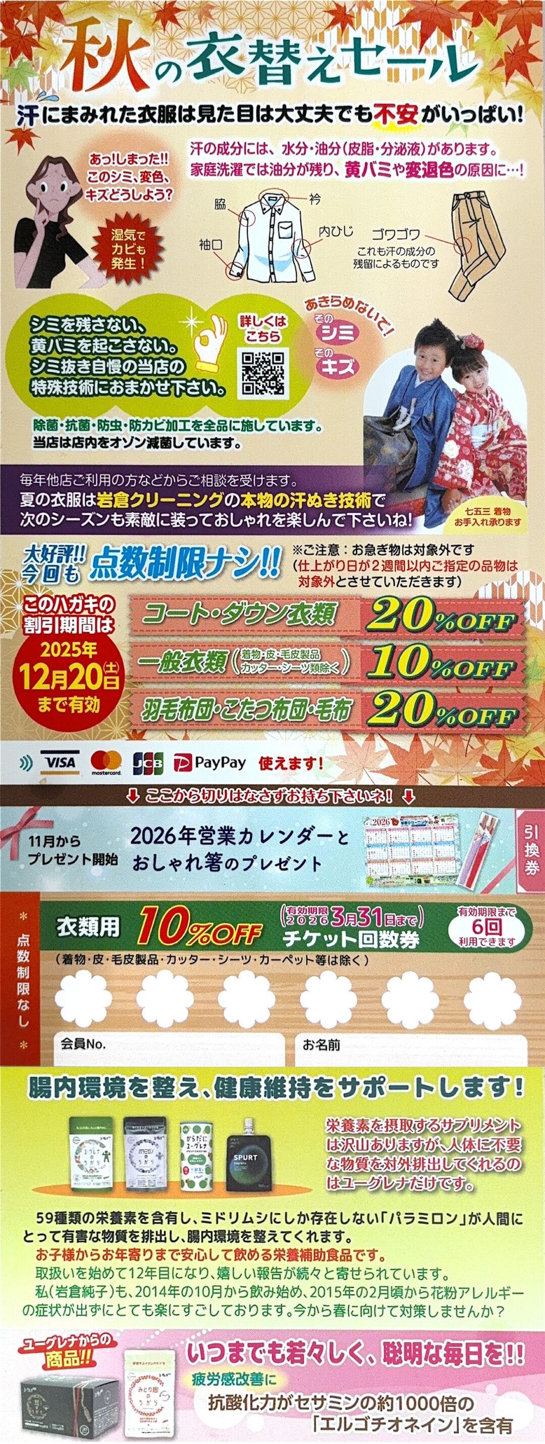 ◆秋の衣替えセール◆ハガキの割引期間2025年 12/20(土)までここから切りはなさずお持ちくださいネ!以下の割引チケットは2026年 3/31迄ですので捨てずにお持ちください。多くの特典がございます!